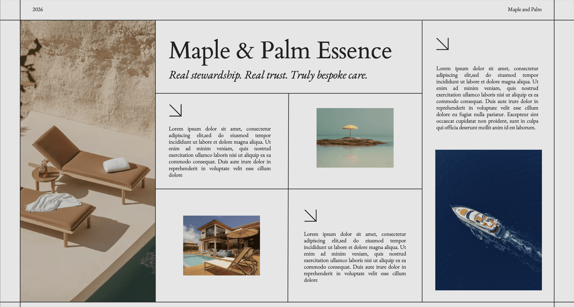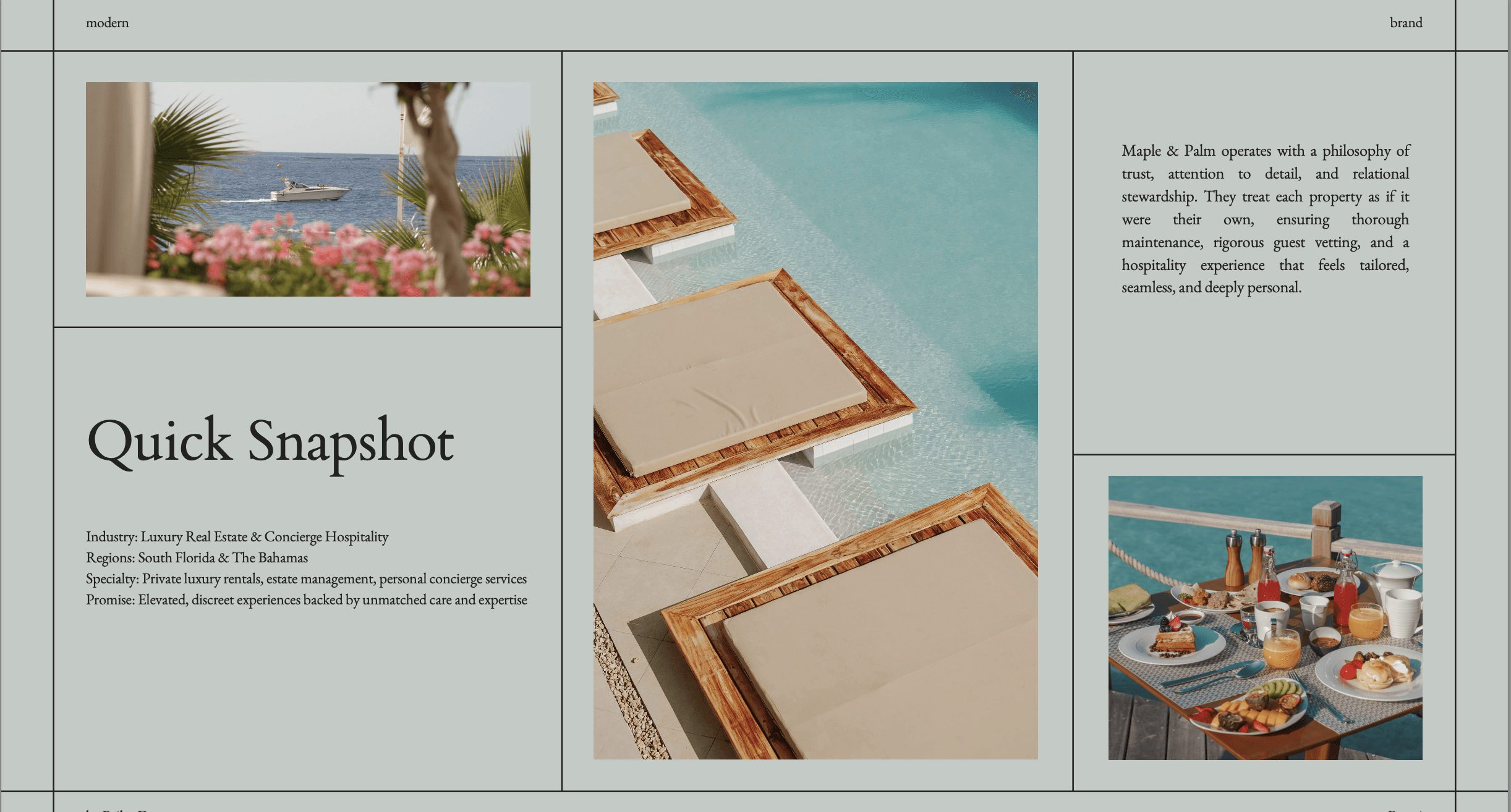 Maple & Palm wanted an identity tht was minimalist, timeless, and spoke to their target audience. Given their logo and the notion that green should remain involved, the identity shaped itself into a sleek, modern, and expensive looking brand.
